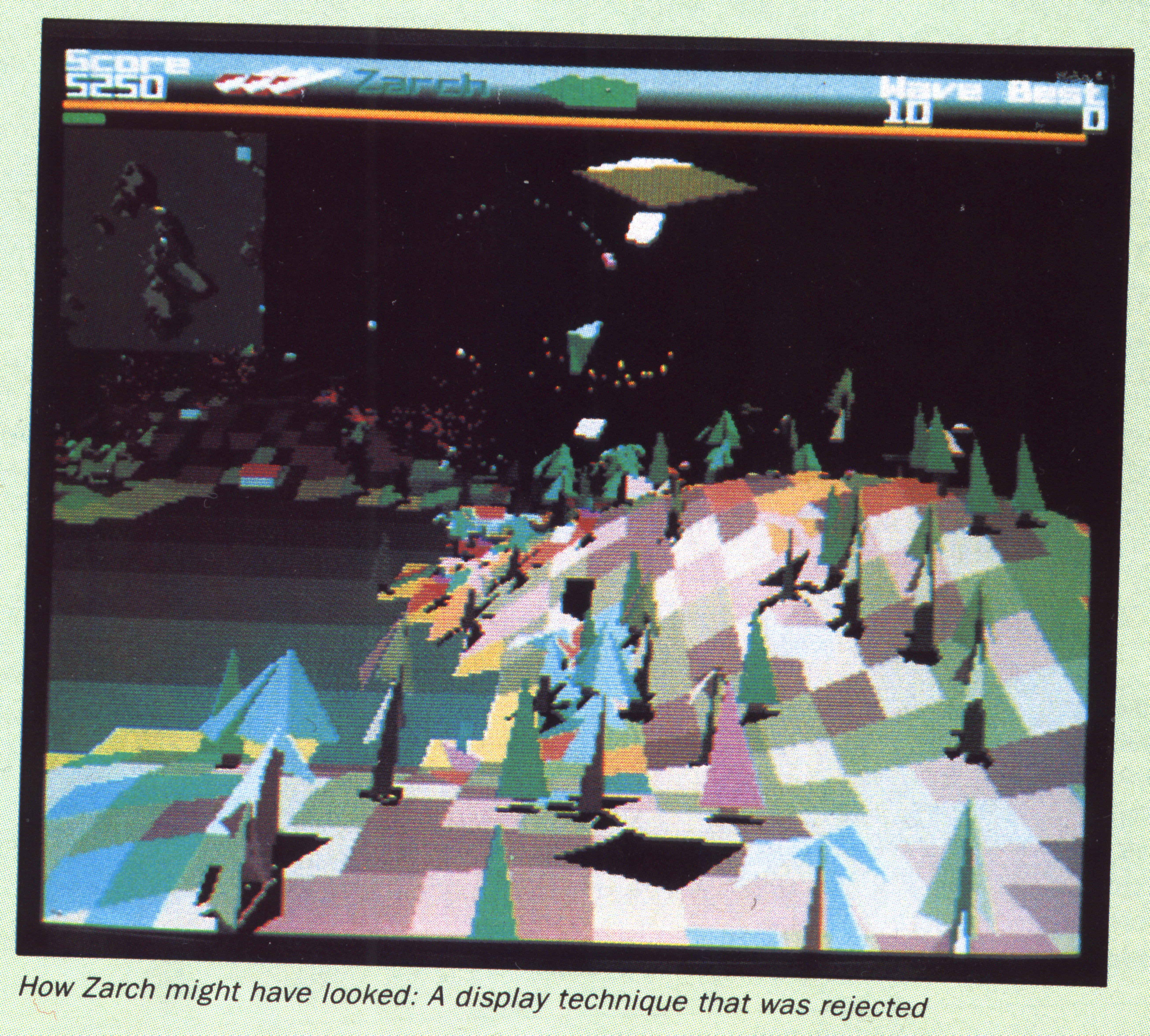 Braben experimented with broader views, but the frame rate suffered. A dynamic rendering system he tried unfortunately shrank the landscape whenever enemy craft appeared, and was dropped.